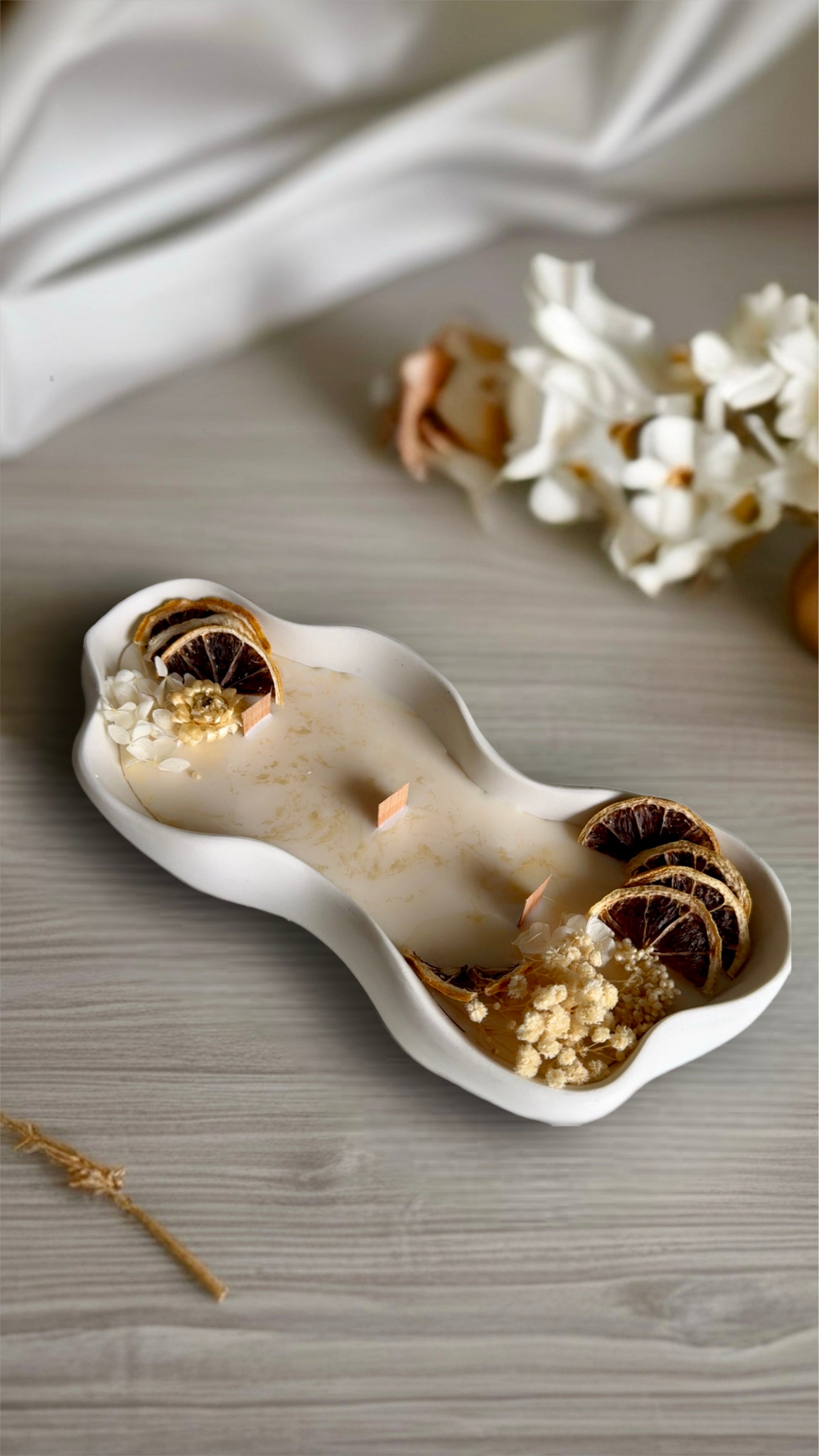 Una vela artesanal en recipiente ondulado de yeso blanco, decorada con rodajas secas de cítricos, flores preservadas y mechas de madera. Su aroma fresco y cálido crea un ambiente sereno y natural. Ideal para momentos de relajación o como pieza decorativa única.